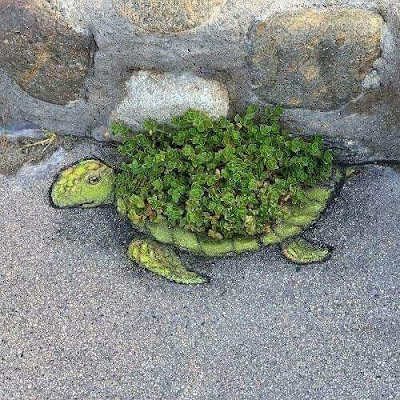 An artist created a cute tortoise near wall on the street. He chose a place a small plant came out and made it as tortoise back.