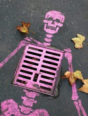 Funny skeleton painted over a drain hole on a street. Look like real and dangerous for children.