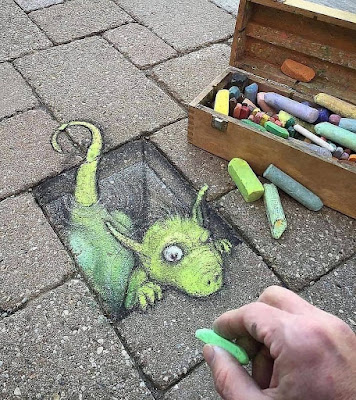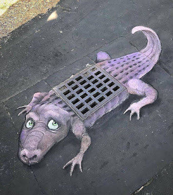 With the help of colorful sticks, an artist created amazing 3d creature look like coming out from water on a street footpath.