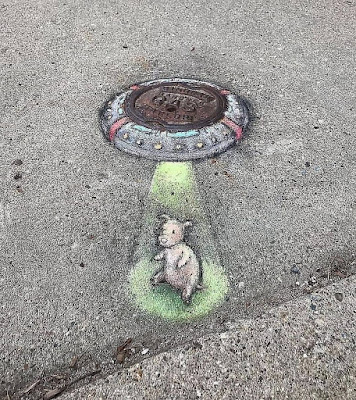 A manhole of underground gutter line converted into alien UFO. Amazing creativity of the artist