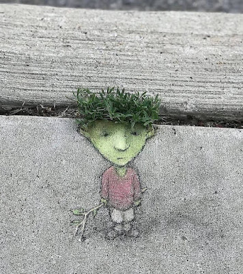Artist created cute boy near street where some grass come out and make it hair of the boy.