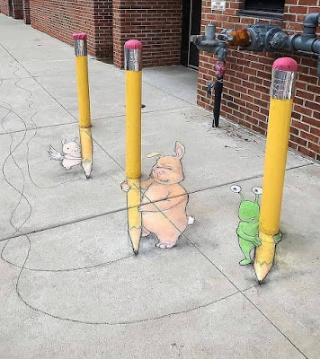Artist converted poles on a street into real look of pencils which hold by some cartoon characters. Place like there are always attractions for children.